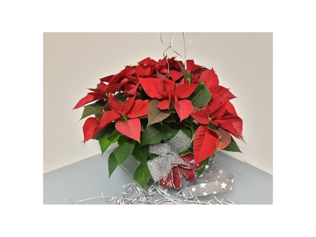 La típica flor de Pascua colocada en un hermoso cesto con el que podrás decorar tu casa o cumplir con ese amigo con el que no puedes estar.