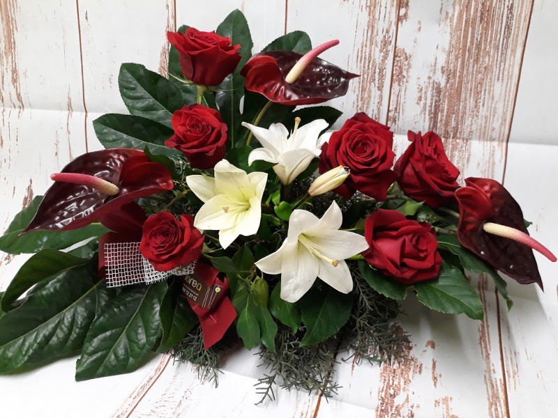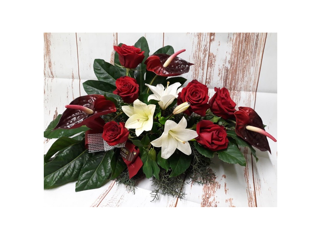 Compuesto por rosa rojas , anthurium rojo , flor de lilium , hojas y varios verdes
