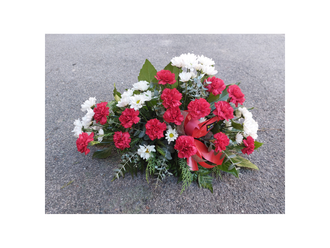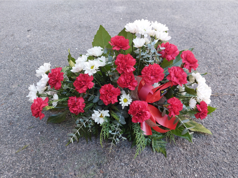 Centro funerario Todos los Santos realizado con clavel y margarita blanco y rojo en base rectangular