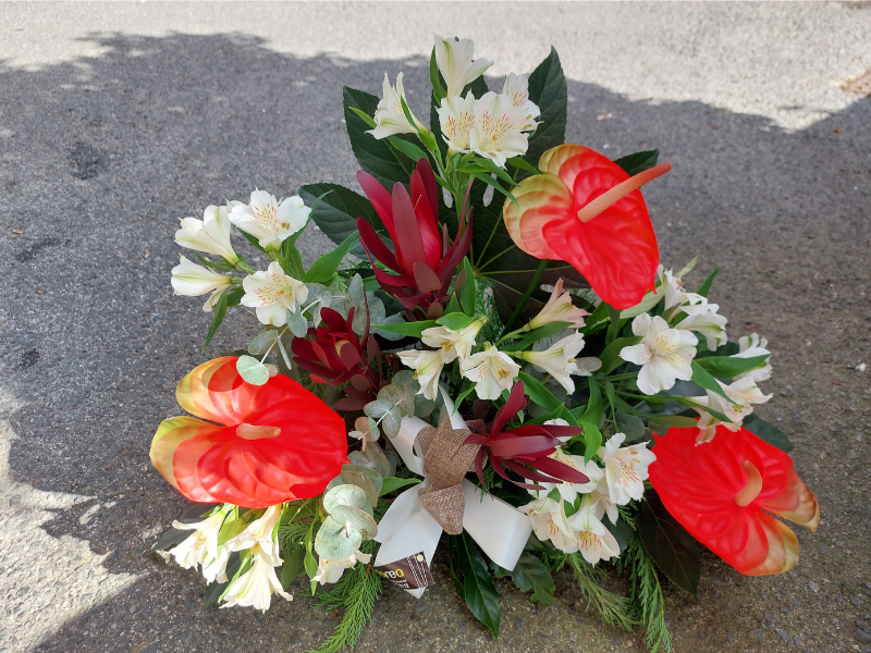 Centro flores para Todos los Santos realizado con flor de Anthurium y astromelias
