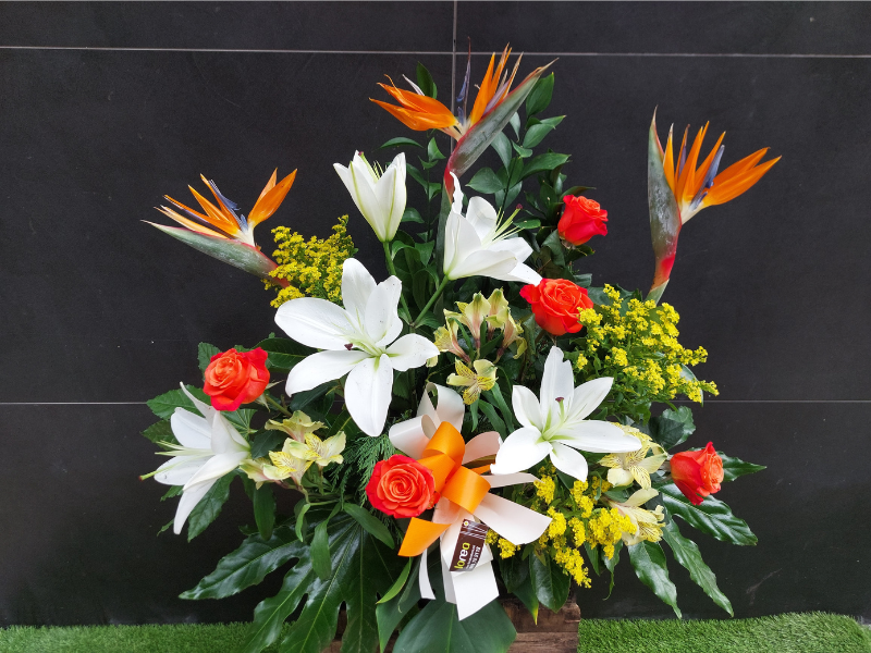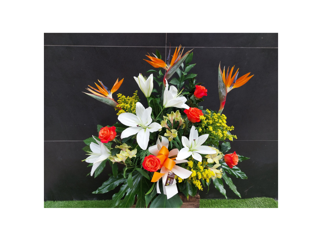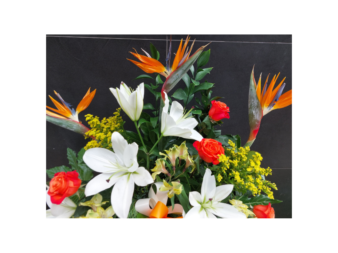 Flores que lleva sterlicias, lilium oriental, astromelias, rosas , solidago y verdes.